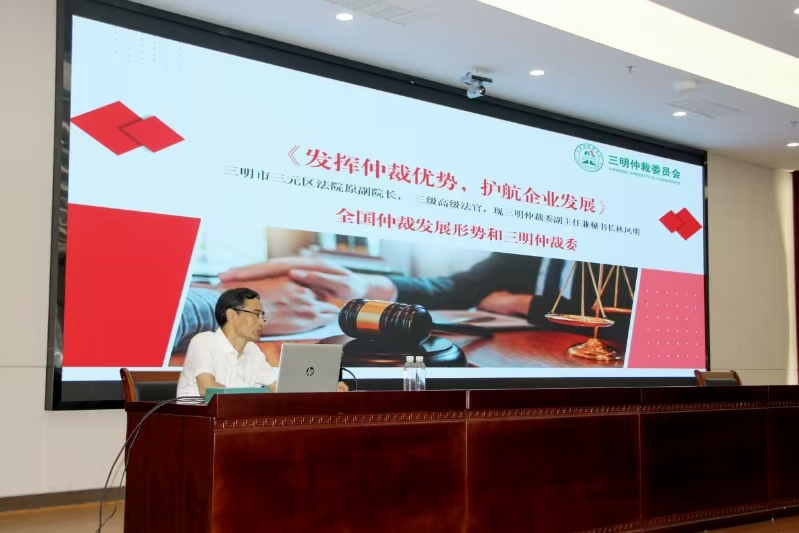 讲座过程中,三明仲裁委副主任兼秘书长林凤明以自身丰富的理论知识和实践经验,从什么是仲裁,仲裁与诉讼有哪些相同、哪些不同,仲裁委受理的案件范围,为何商事合同纠纷优先选择仲裁,如何选择仲裁等5个方面详细讲解了仲裁制度的相关内容,让与会人员深刻了解了仲裁和民事诉讼的区别和优势,拓宽了企业在商事纠纷中的矛盾解决机制和途径。