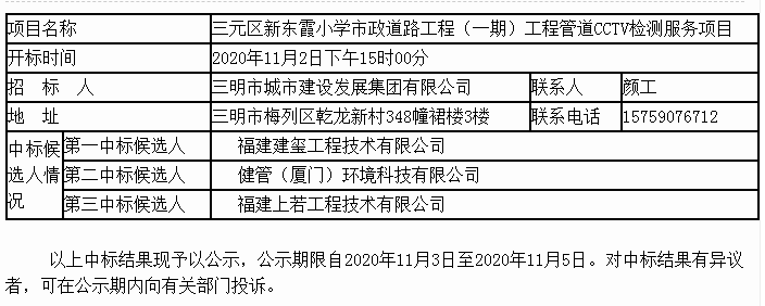 三元区新东霞小学市政道路工程(一期)工程管道CCTV检测服务项目比选中标公示